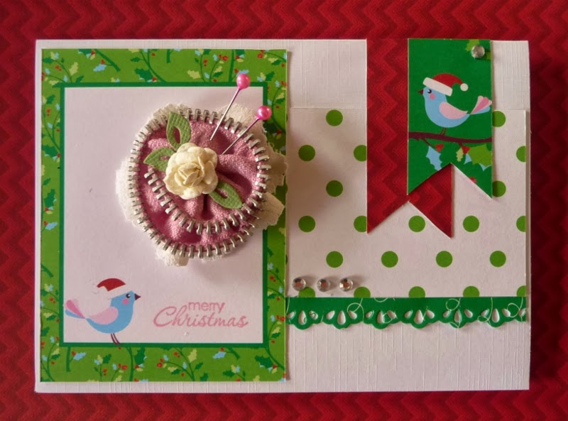 Deze inzending is van Yvon van Heugten Doensen, zij heeft een mooie bloem op haar kaart gemaakt met behulp van een rits. en een reep kant.